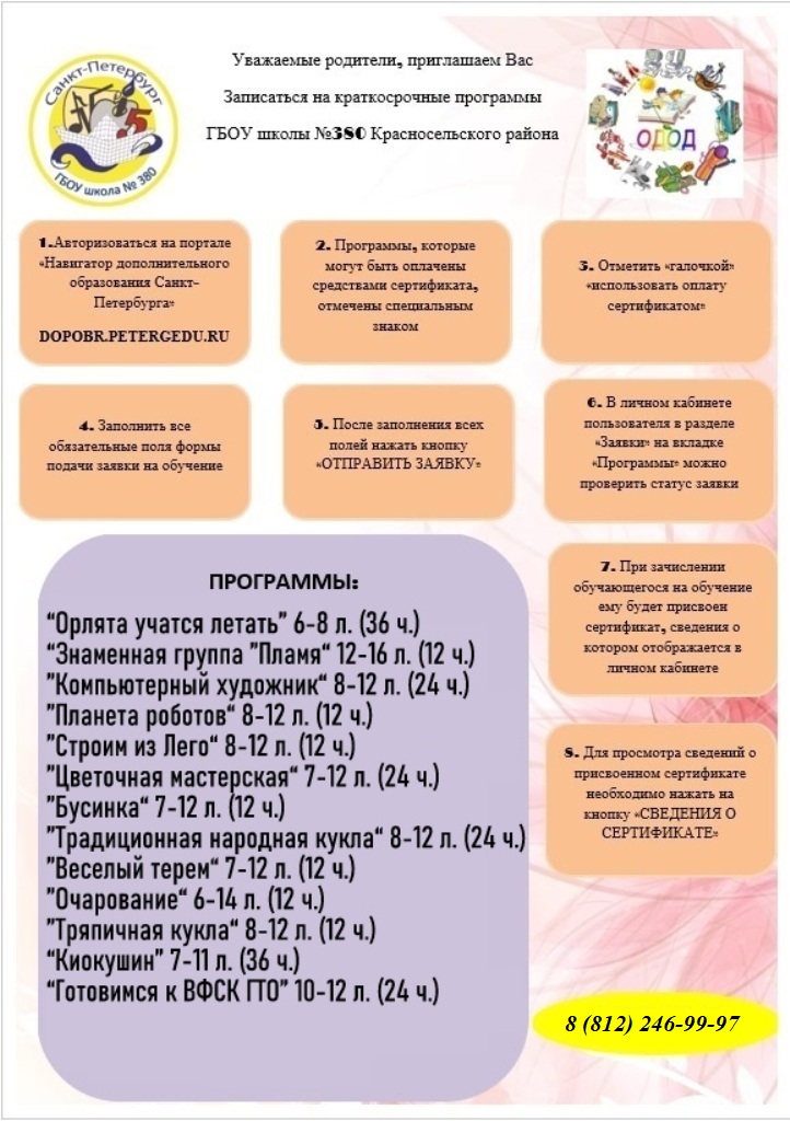 Информация для родителей по записи в объединения ОДОД на портале "Дополнительное образование Санкт-Петербурга"